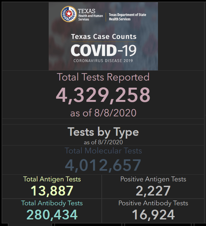 On August 8, DSHS began reporting antigen tests on its Texas Tests and Hospitals dashboard. The August 8 numbers include about 14,000 total antigen tests, with about 2,000 positive results. Based on the Houston Chronicle’s analysis, this is likely a significant undercount—but at least Texas is starting to publish some numbers.