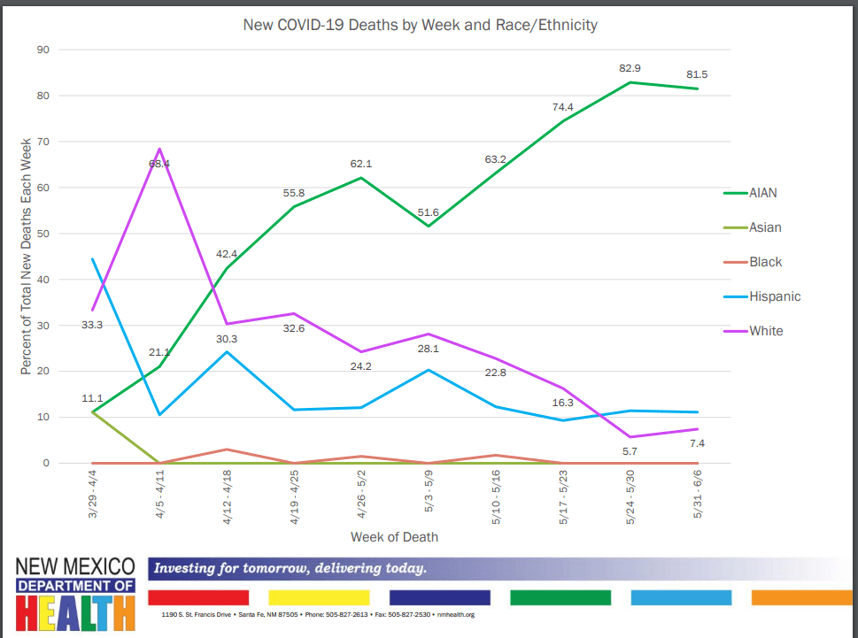 New Mexico’s newest Modeling Update, released this past Tuesday, has shown a slight improvement in the state’s data presentation: the percentages are now expressed in bar charts, and total deaths for each racial group are included below the graph. (See page 20 of the PDF.) Still, in order to present a complete picture of how COVID-19 is impacting minorities in New Mexico, the state must release these data regularly and include precise figures.