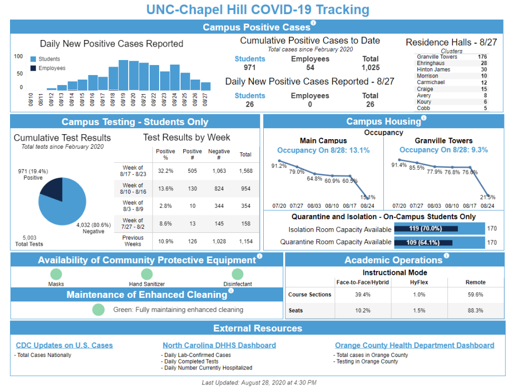 - University of North Carolina at Chapel Hill: UNC-Chapel Hill gets a shout-out for being the only dashboard I analyzed to report COVID-19 cases by residence hall. The university’s overall COVID-19 response may have been a clusterfuck, but at least their dashboard gives students information to help them manage it.