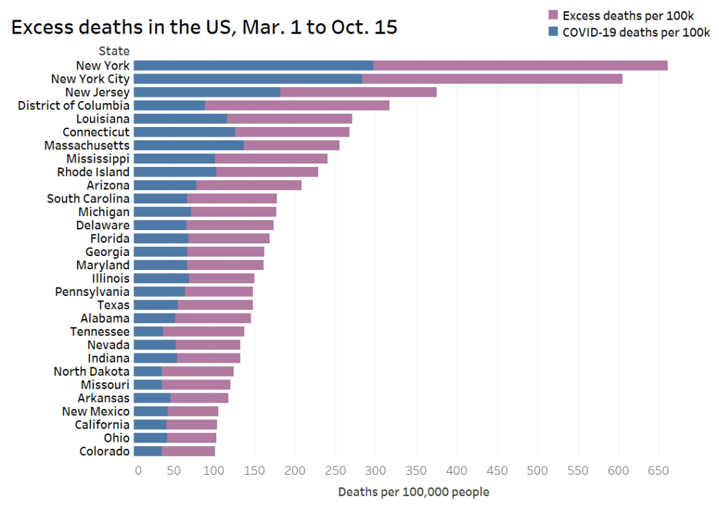 I am certainly part of that trend; I’ve started learning Tableau since the pandemic started. But a recent Stacker story allowed me to pay homage to the real viz experts. I compiled 50 charts from public sources which show the impact COVID-19 has had on America and the world at large, including a few charts I made myself. The charts visualize case counts, mortality comparisons, economic indicators, outbreak sites, and more. Frequent readers of this newsletter might recognize a few of the sources I used.
