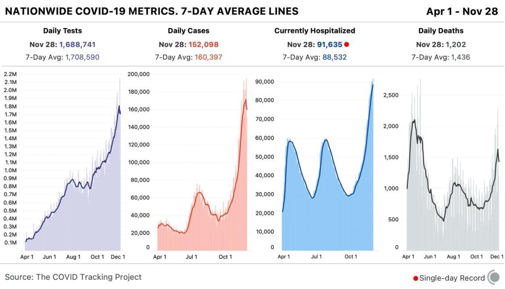 And indeed, new daily cases dropped from 183,000 on Wednesday to 125,000 on Thursday, rose to 194,000 on Friday, then dropped back to 152,000 on Saturday. Even in the states which still reported new cases, deaths, and tests on Thanksgiving, many testing sites and labs were closed, further contributing to reporting backlogs and discrepancies.