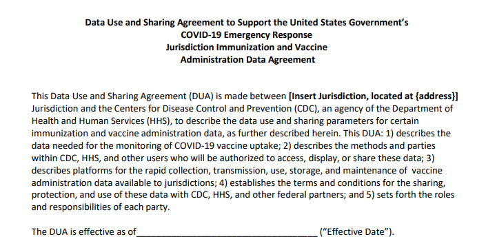 Historically, each state has tracked vaccinations independently, through Immunization Information Systems (or IIS). While the CDC does report some national immunization information, such as its flu vaccination dashboard, this information typically comes from outside surveys and is not reported in real-time. Of course, this won’t do for COVID-19. To build up a national system, the CDC has asked every state to sign a Data Use and Sharing Agreement promising to send vaccination counts and associated demographic data to the CDC.
