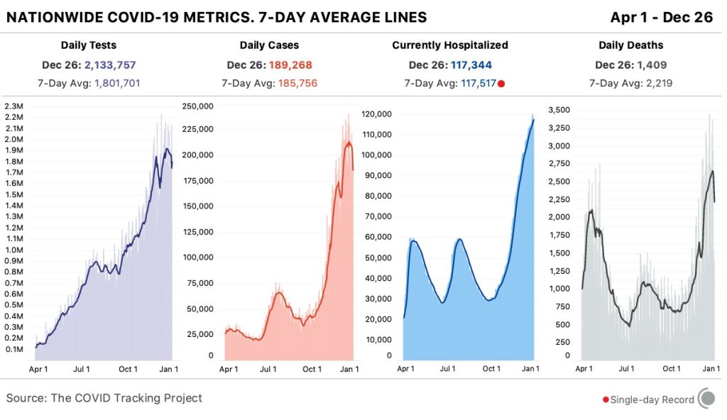 But while public health agencies may take a day off, hospitals never close. This week, more Americans were hospitalized with COVID-19 than ever: the number peaked on December 24, at over 120,000. That’s double the highest national patient number we saw in the spring or summer.