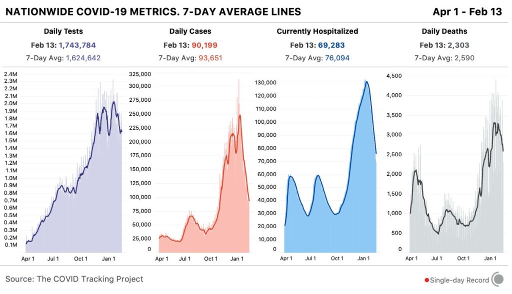 In the past week (February 7 through 13), the U.S. reported about 656,000 new cases, according to the COVID Tracking Project. This amounts to: