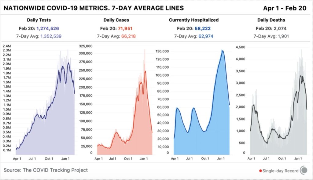 In the past week (February 14 through 20), the U.S. reported about 464,000 new cases, according to the COVID Tracking Project. This amounts to:
