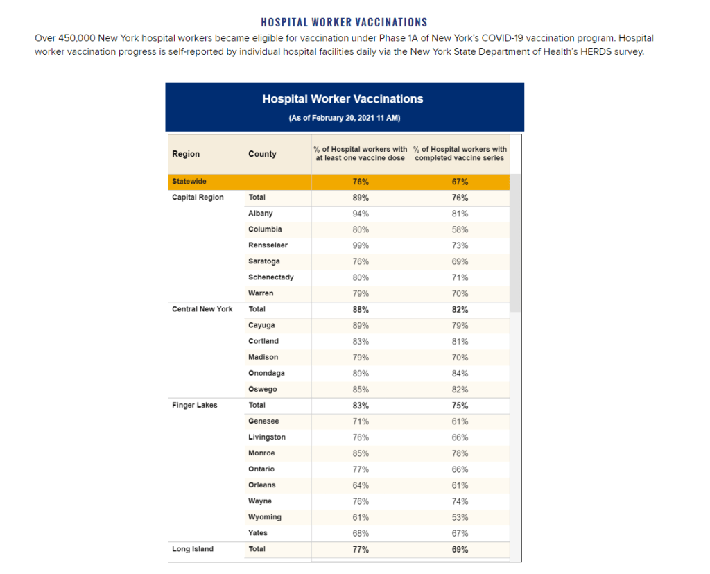 This isn’t just a problem with the New York state dashboard. According to our updated annotations on state vaccination data sources, not a single one reports out vaccination by occupation. I suppose I shouldn’t ask for so much—only 36 states report vaccination by race and ethnicity, which I thought was the bare minimum—but I’m used to getting disappointment at this point.