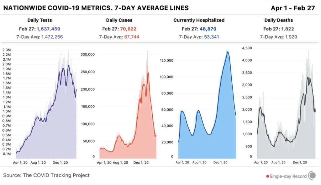 After several weeks of declines, cases now appear to be in a plateau. But the COVID Tracking Project cautions that these numbers may also be the aftershocks of President’s Day and the winter storm, which led to artificially low numbers last week and delayed reporting arriving this week.