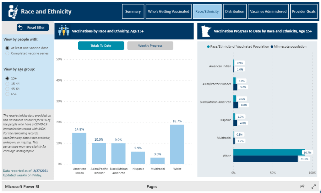 One of the newest states to start reporting race/ethnicity vaccination data is Minnesota. At a glance, the Race/Ethnicity tab of the state’s vaccine data dashboard looks comprehensive: it includes demographic data stratified by age, as well as a bar chart that compares the population that’s been vaccinated to Minnesota’s population overall.