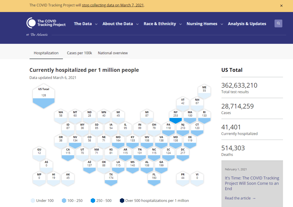 The COVID Tracking Project’s homepage on March 7, 2021.
