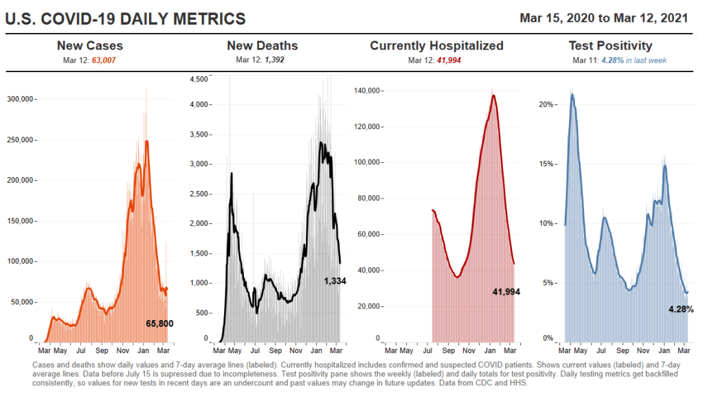 Note: Since the COVID Tracking Project ceased data collection last Sunday, March 7, I am now using CDC data for these updates. I’m primarily relying on the agency’s COVID Data Tracker Weekly Review reports.