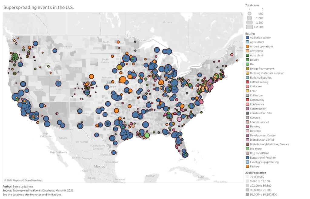 You can check out the U.S. superspreading events in the database below. I made this visualization in November and updated it this past week.