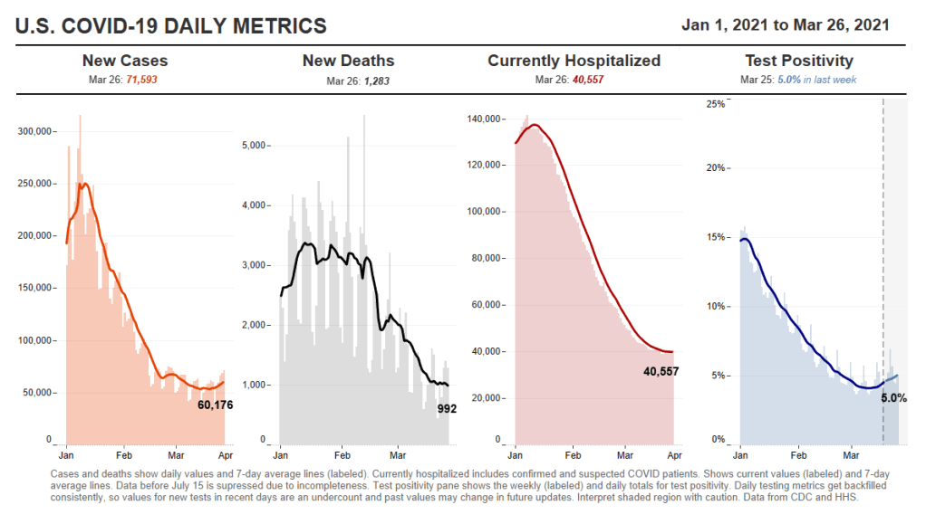 After several weeks of declines, our national count of new cases has started creeping up: the current 7-day average is 57,000, after 53,000 last week and 55,000 the week before. Michigan continues to see concerning numbers, as do New York, New Jersey, Florida, Texas, and California—all states with higher counts of reported variant cases.