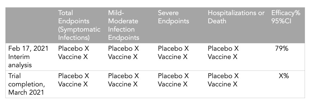 Independent reviewers from the data and safety monitoring board sent “a harsh note” to AstraZeneca, according to Anthony Fauci, and sure enough, it soon became clear that AstraZeneca had released outdated (better) numbers instead of the real results from the trial, obfuscating how efficacious the vaccine actually was in the U.S. trial.