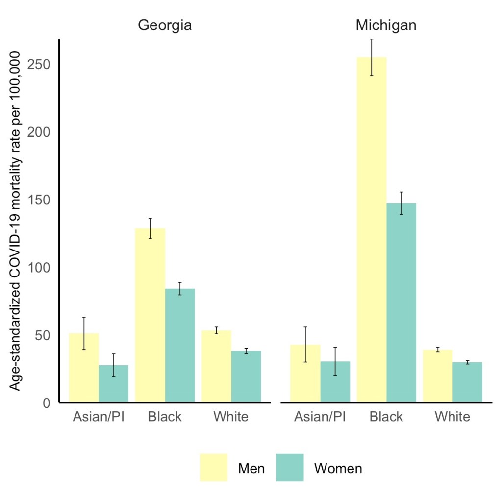 For their recent study, GenderSci Lab researchers Tamara Rushovich et al. used data from the only two states that provide COVID-19 mortality data on sex, race, and age: Georgia and Michigan. The patterns they found in both states complicate the well-known trend that men are more likely to die of COVID-19 than women.