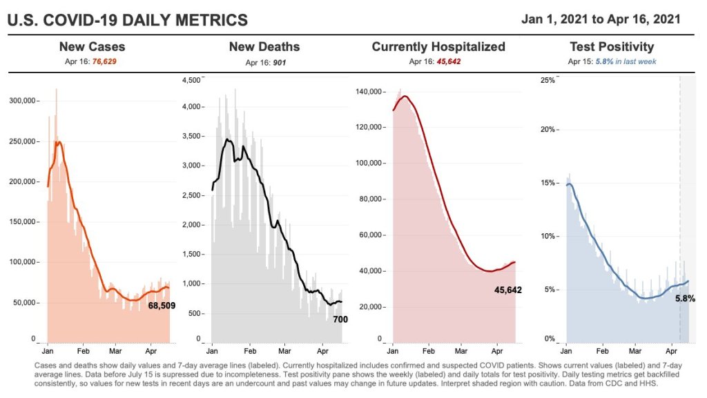 Will these vaccinations be enough to break the tide of variant cases? I hope so. The vaccines at least appear to be protecting our most vulnerable neighbors so far, though; the death rate has remained below 1,000 per day despite several weeks of rising cases and hospitalizations.