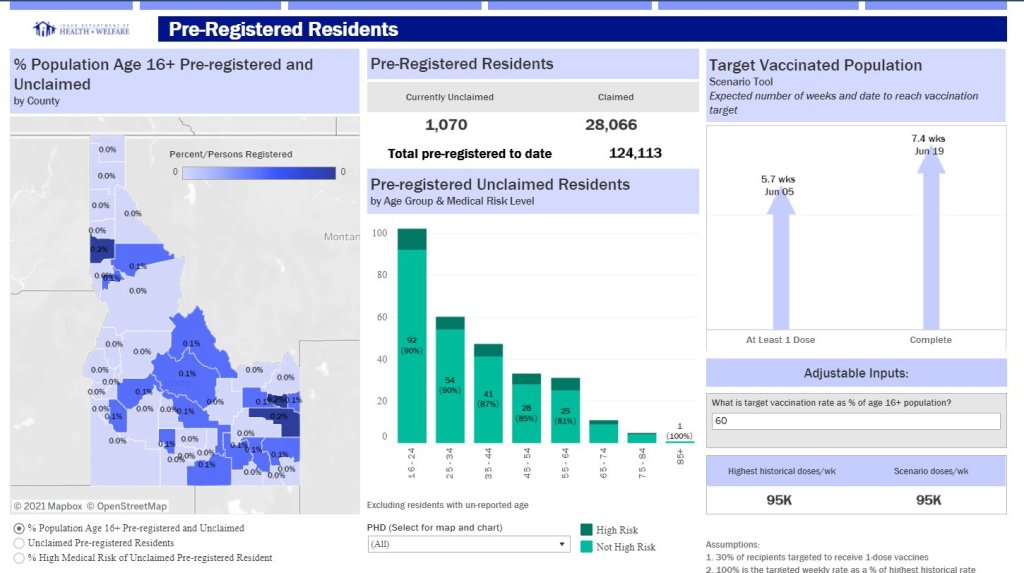 • Idaho: Reports detailed data on state residents who have pre-registered for appointments. On the “Pre-registered residents” tab, you can see how many people have claimed their pre-registered appointments, as well as breakdowns of the pre-registered residents by county, age, and medical risk level.