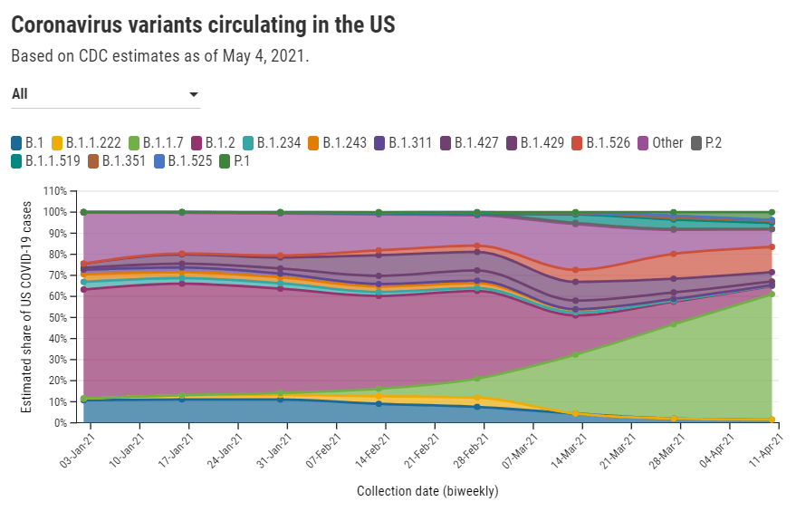 In other words, when the CDC tells us that B.1.1.7 now makes up about 60% of new cases in the U.S., remember that this number is a snapshot from a month ago. The true number as of today, May 9, is likely far higher.
