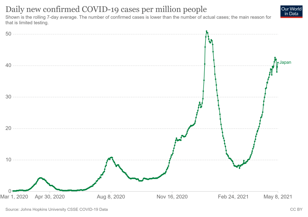 They’re definitely not ready now. The Japanese government just announced it would extend an already-standing state of emergency through May 31 following a large spike in COVID-19 cases. After “Golden Week,” a sequence of Japanese Holidays lasting from late April to early May, Tokyo reported 907 new cases for the week. (New York City reported 985 cases just on May 7, for comparison.) A variant called N501Y has caused recent surges in cases, like in Osaka where hospitals struggled to treat the influx. N501Y is more infectious, and it has been correlated with more serious cases.