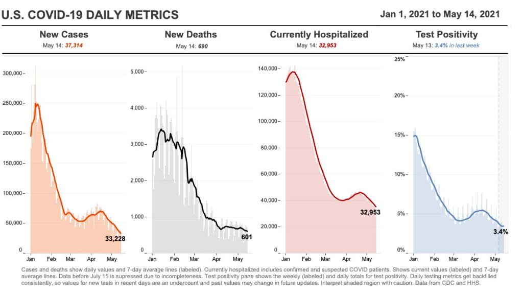 COVID-19 case numbers continue to drop this week: the current U.S. average is about 35,000 new cases a day, a 50% drop from where we were a month ago. (We saw 70,000 new daily cases in the week ending April 16.) Daily cases have not been this low since early September, between the summer and fall/winter surges.