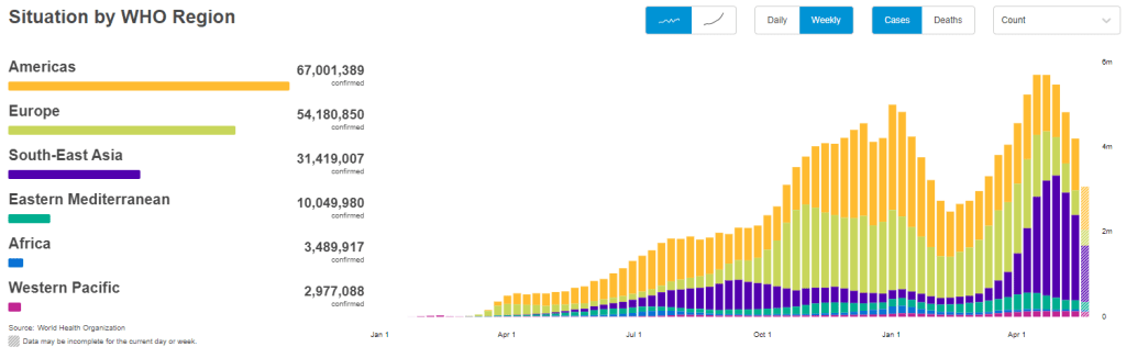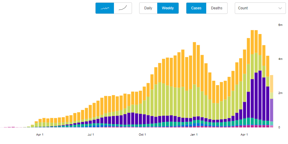 But the harm these variants can cause in the heavily-vaccinated U.S. pales in comparison to the risk they pose in other nations. As evidenced by the World Health Organization chart above, the share of cases in Southeast Asia and other lower-income nations is increasing even as cases in the U.S. and Europe drop. The U.S. should focus on providing aid to the nations where vaccinations are lagging so that we can help inoculate people before more, harder-to-contain variants evolve.
