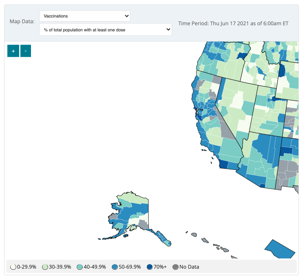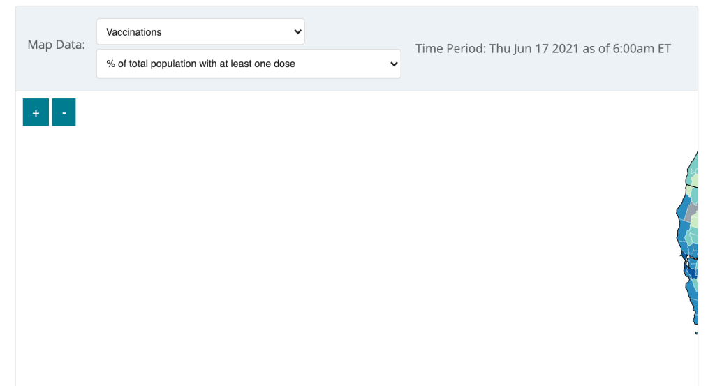 The map does paint a stark picture of vaccination disparities in the U.S., with the Northeast and West coast notably darker blue than parts of the South and Midwest. However, the CDC’s UI leaves much to be desired.
