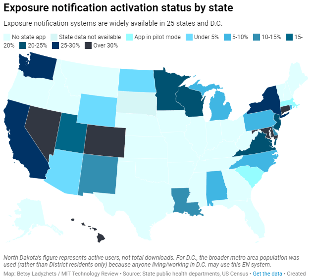 This week, I have a new feature out in MIT Technology Review. It’s an investigation into the usage rates and public opinion of exposure notification apps—those Bluetooth-enabled systems that promised to function as a method of digital contact tracing. You can read the story here; and for the CDD this week, I wanted to provide kind-of an extended methodology behind the piece.