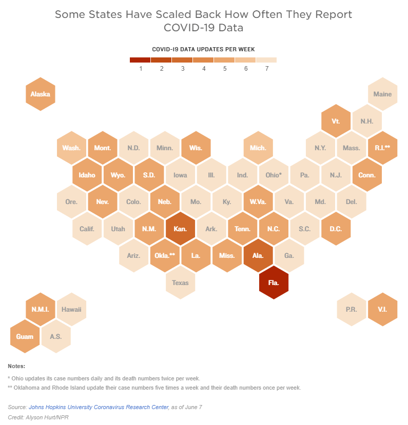 Other states are making similar changes. Only about half of states update their COVID-19 data every day, NPR reported last week. Florida is the only state to cut back to only one update a week, but several others now skip updating on weekends or otherwise reduce their reporting load.