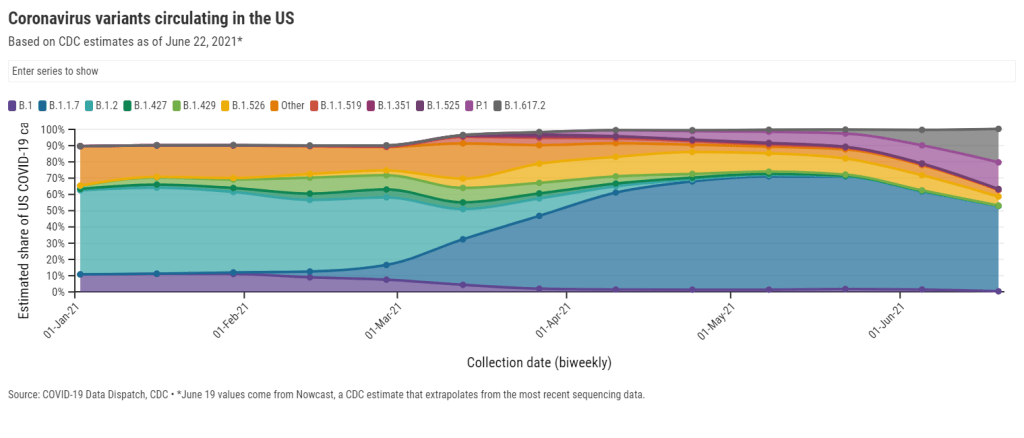 The Gamma variant now causes an estimated 16% of cases in the U.S. while the Delta variant causes 21%, per the CDC’s most recent data (as of June 19). Both are rapidly increasing as the Alpha variant declines, now causing an estimated 53% of cases.