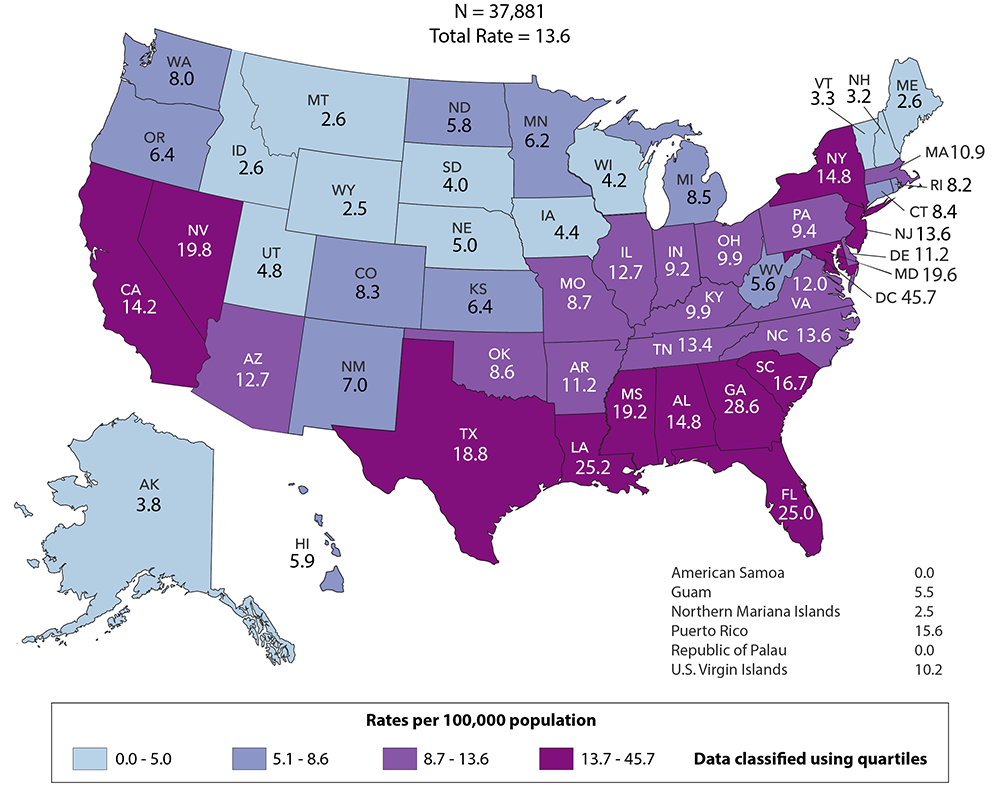 In the U.S., the South has higher HIV infection rates than any other part of the country. Black Americans are diagnosed with the virus at rates almost ten times higher than white Americans, according to CDC data from 2014 to 2018. At a global scale, the virus disproportionately impacts African nations; Swaziland has the highest infection rate, at 27%.