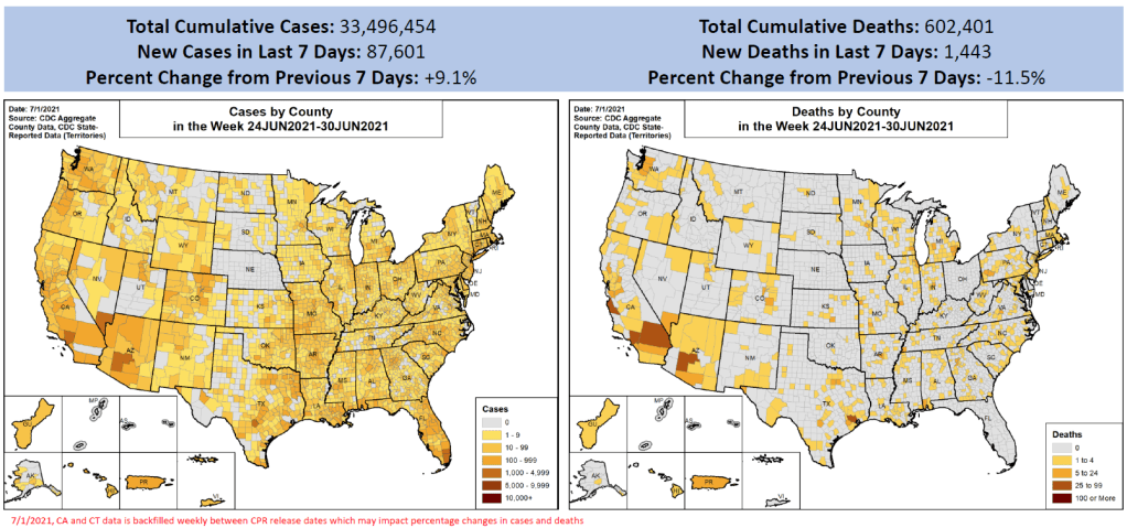 Nationally, hospitalizations also rose very slightly this week, while deaths remained low, at about 200 new COVID-19 deaths each day. The vaccines continue to protect seniors and other more vulnerable people from severe disease. But it is likely that, in the coming weeks, these numbers will start to rise in the areas seeing Delta outbreaks. Many Midwest hospitals are already filling up.