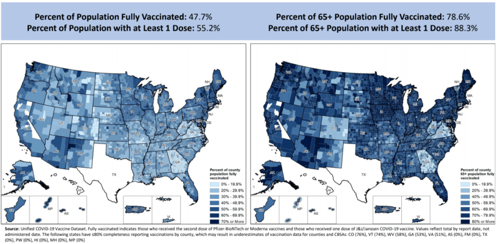 What’s up with Texas? A reporter friend recently asked me this question, inspiring me to look into the issue. There’s limited information directly on the CDC dashboard; a vague note in the Community Profile Reports simply notes that several states have “ ≤80% completeness reporting vaccinations by county,” including Texas at 0%—implying that the states, rather than the federal agency, is at fault.