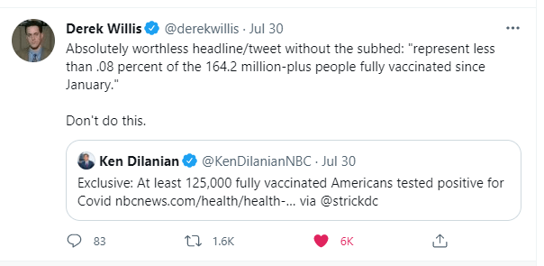 Any news article, headline, or tweet about breakthroughs should make that denominator explicitly clear—something that one NBC reporter failed to do when sharing his outlet’s story on Friday.