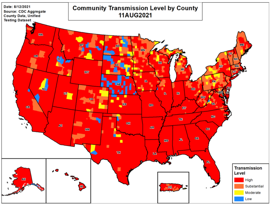 This surge’s silver lining continues: vaccinations are still going up. Almost one million new doses were reported in a single day on Saturday. But vaccination alone is not enough to completely stop COVID-19’s spread, especially when a variant as contagious as Delta has taken the reins.