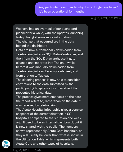 After posting that dashboard on Twitter, I kept hearing that people wanted a replacement for DHEC’s hospitalization dashboard which, at the time, only updated on Tuesdays. So, I made a similar dashboard that provided more information and allowed users to filter down to specific days and individual hospitals, then I tweeted it at DHEC. Admittedly, this probably wasn’t the smartest move.