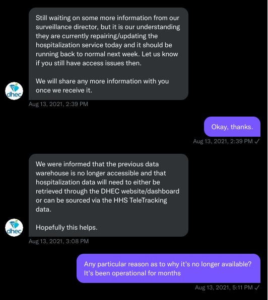 I asked for information on why the API was no longer operational; DHEC responded that they had overhauled their hospitalization dashboard, resulting in changes to how they ingest data from the federal government. This response did not make it clear why DHEC needed to put authentication on the daily facility-level hospitalization data.