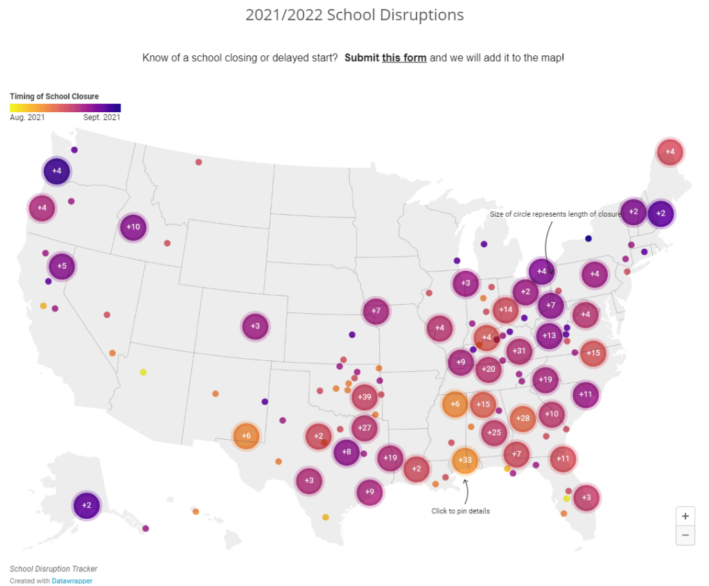 The school districts that closed include Scott County School District 1, the subject of our first “Opening” profile. This Indiana district originally opened in August 2021 with no mask requirement; cases quickly climbed, leading the district to shift to virtual instruction for two weeks. When students returned to classrooms in late August, masks were required once again.
