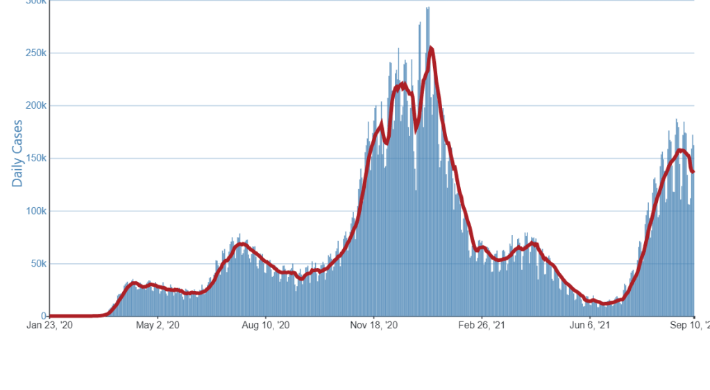 All of these states, of course, have low vaccination rates—under 50% of their populations are fully vaccinated. While vaccination rates rose nationally in August, dose counts now seem to be going down again: from a daily average of one million last week to 700,000 now.