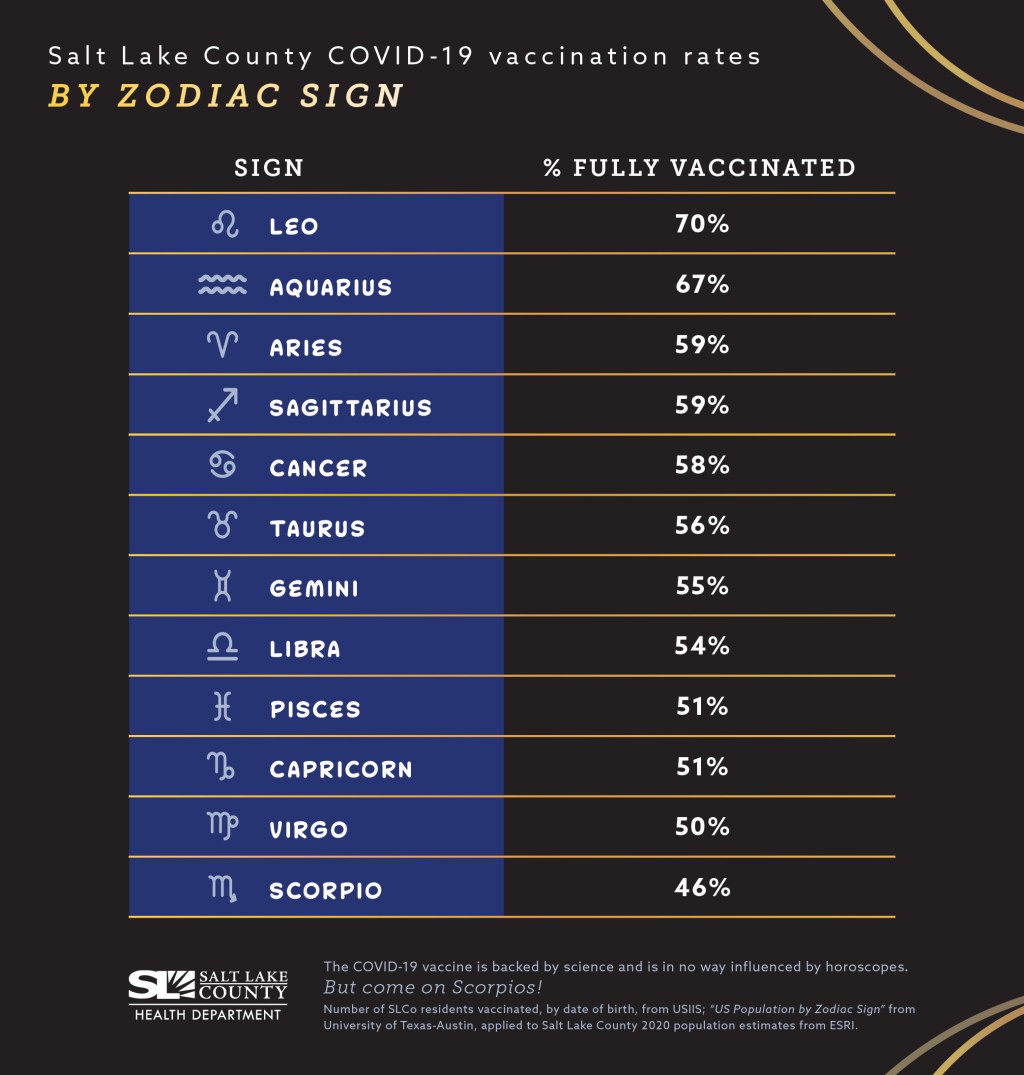 In this case, the researchers used estimates of Zodiac sign representation in the entire U.S. population, apparently calculated in 2012. Not only are these numbers based on birthdays across the entire country (which could be pretty different from the birthdays in one Utah county!), they’re almost ten years old. There’s a lot of distance between these estimates and vaccination numbers among a 2021 Salt Lake City population.