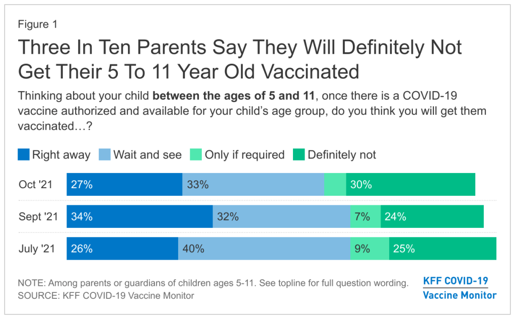 Polling data suggest that many parents don’t currently deem it necessary, though. The latest survey from the Kaiser Family Foundation found that just 27% of parents with kids in the 5 to 11 age range plan to get their kids vaccinated immediately, once shots are available. 33% intend to “wait and see,” 5% will only pursue vaccination if it’s required by the child’s school, and 30% say “definitely not.”