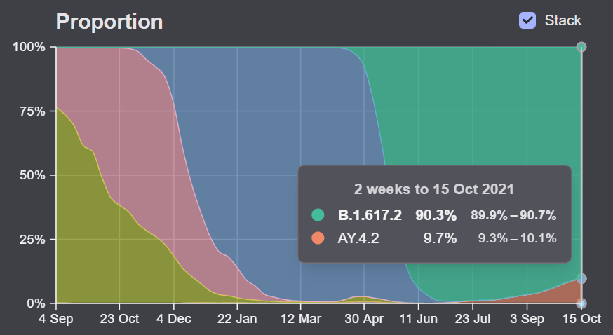 AY.4.2, an offshoot of the Delta variant, now comprises about 10% of new COVID-19 cases in the U.K. Chart via U.K. COVID–19 Genomic Surveillance.