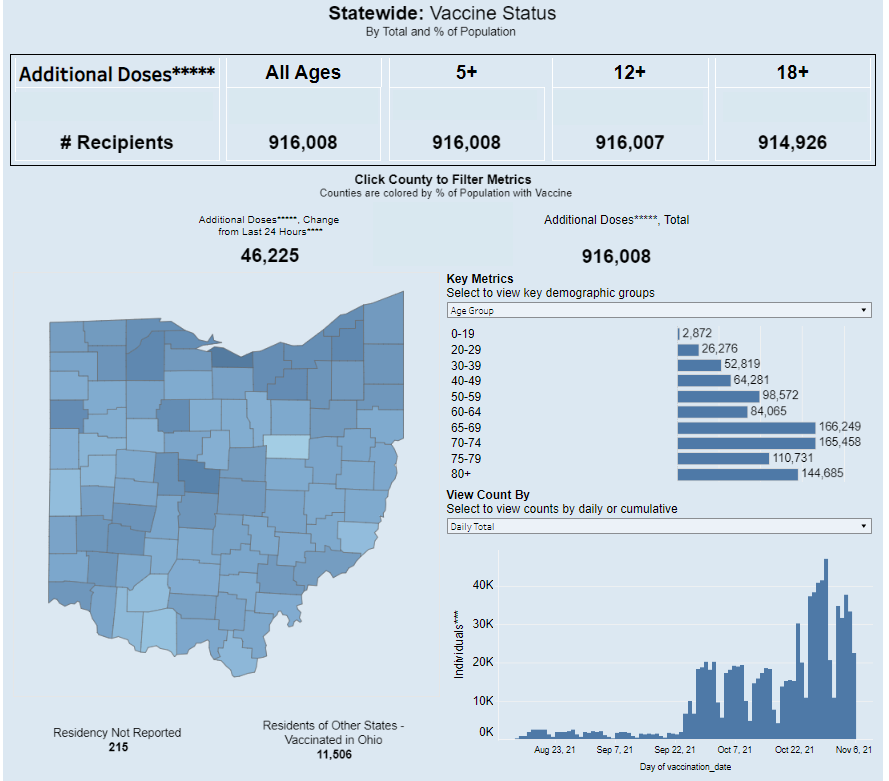 - Ohio: Reporting demographics (age, race/ethnicity, and sex) as well as doses administered by day and by county.