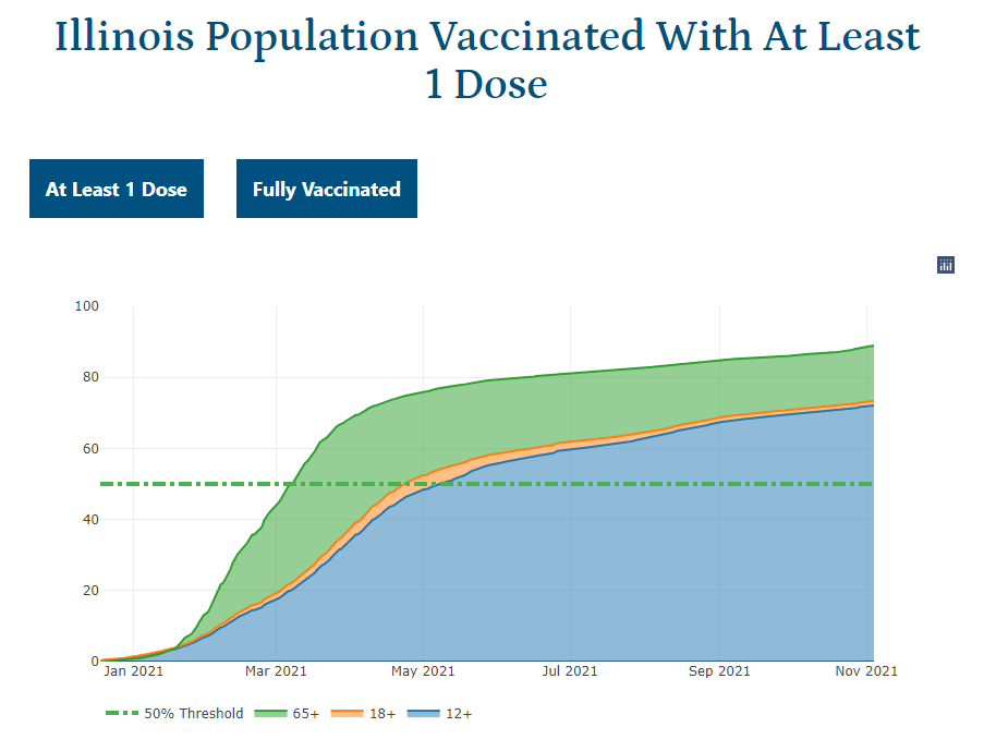 The new dashboard includes one vaccination chart on its homepage: vaccinations among Illinois residents over time (at least one dose and fully vaccinated). You can download vaccination data by county through the dashboard’s data portal section. And there are vaccination charts included in both the “long-term care data” and “school and youth data” pages.