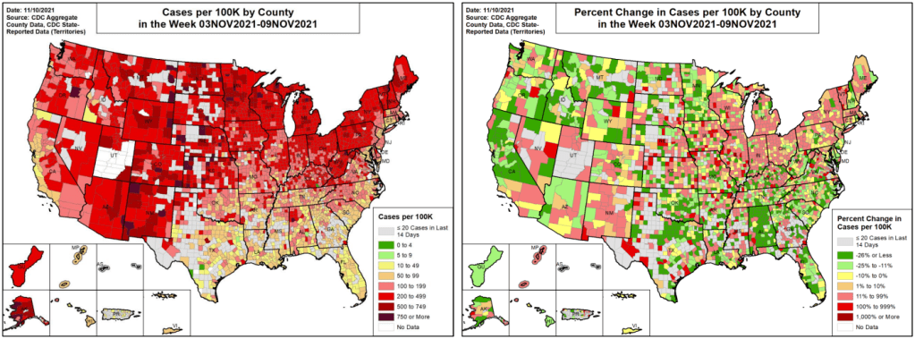 Of course, we have vaccines to thank for this improved position. More than two-thirds of the U.S. population has received at least one vaccine dose; as of this week, that number includes over one million children under age 12, according to the CDC. Vaccinating more children and other people who are currently unvaccinated, booster shots for seniors, and continued use of masks and testing can help keep case numbers (relatively) low as we head into the coldest months.