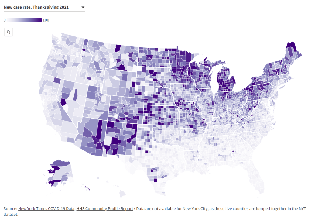 - On November 23, 2021 (two days before Thanksgiving), the seven-day average of new COVID-19 cases was about 94,000 new cases a day. That’s about 45% lower than last year’s number, 170,000 new cases a day (on November 26, 2020, Thanksgiving itself).