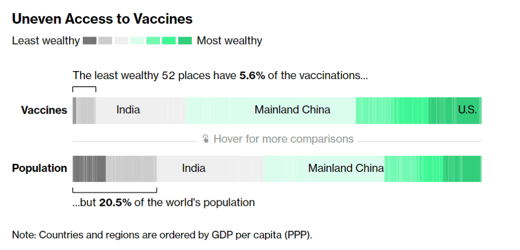 Considering that most COVID-19 vaccines are two-dose series—and boosters will likely be necessary to combat Omicron—those doses are just a drop in the bucket. According to Bloomberg’s vaccine tracker: “The least wealthy 52 places have 5.6% of the vaccinations, but 20.5% of the world’s population.”