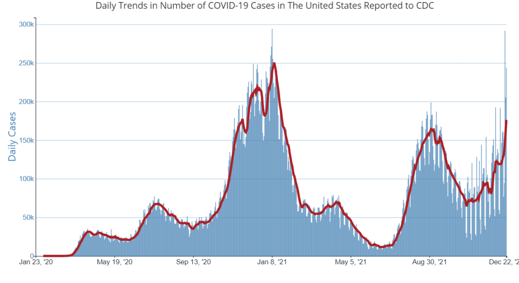 Last week, the Omicron surge had clearly arrived; this week, it’s picking up steam. Nationwide, the U.S. reported well over one million new cases this week—more than a 40% increase from last week. 244,000 cases were reported on Thursday alone, and the daily new case average is now higher than at any point during the Delta surge.