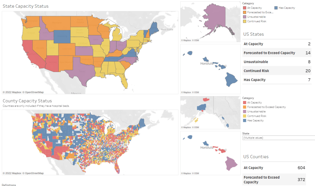 var divElement = document.getElementById(‘viz1642354079303’); var vizElement = divElement.getElementsByTagName(‘object’)[0]; if ( divElement.offsetWidth > 800 ) { vizElement.style.minWidth=’1087px’;vizElement.style.maxWidth=’100%’;vizElement.style.minHeight=’1736px’;vizElement.style.maxHeight=(divElement.offsetWidth*0.75)+’px’;} else if ( divElement.offsetWidth > 500 ) { vizElement.style.minWidth=’1087px’;vizElement.style.maxWidth=’100%’;vizElement.style.minHeight=’1736px’;vizElement.style.maxHeight=(divElement.offsetWidth*0.75)+’px’;} else { vizElement.style.width=’100%’;vizElement.style.height=’3027px’;} var scriptElement = document.createElement(‘script’); scriptElement.src = ‘https://public.tableau.com/javascripts/api/viz_v1.js’; vizElement.parentNode.insertBefore(scriptElement, vizElement);From Faust’s descriptions and the accounts of healthcare workers he quotes, it’s also evident that determining between hospitalizations “with” COVID-19 and hospitalizations “from” COVID-19 is not a useful way to spend time and resources right now. Even if some of the COVID-19 patients currently in U.S. hospitals “happened to test positive” while seeking treatment for some other condition, these patients are still contributing to the intense pressure our healthcare system is under right now.