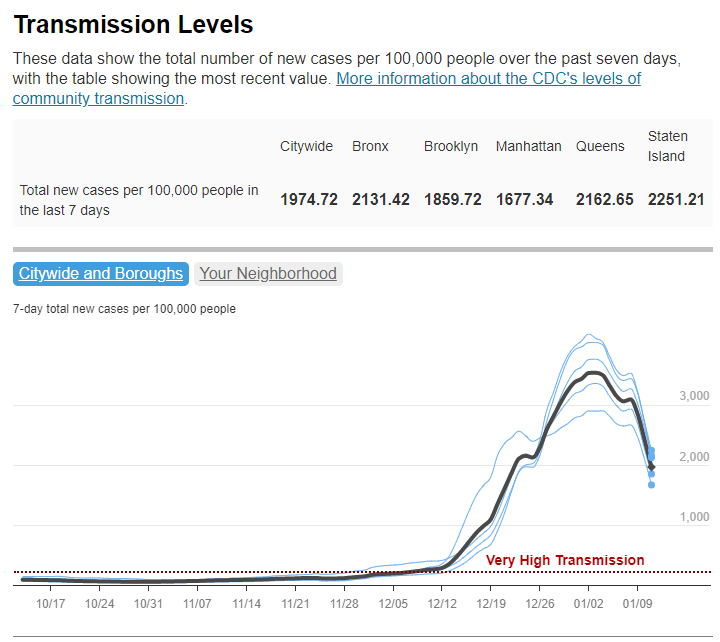 - Major Northeast hotspots appear to be peaking. Last week, I wrote that New York City’s Omicron wave seemed to have reached its peak. The trend has continued into this week: the new case rate and test positivity rate have both fallen consistently since peaking on January 3. Similarly, in Boston, the Omicron levels detected in the city’s wastewater have declined steeply since early January. The daily case rate is also going down in Washington, D.C., and in the Northeast region overall. Still, hospitals are still overwhelmed throughout the region, and it’s unlikely that cases will go down as quickly or as decisively as they went up.