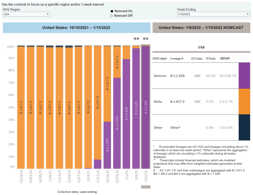 - Omicron is now causing nearly 100% of new COVID-19 cases in the U.S. The latest CDC estimates of variant prevalence put Omicron at 99.5% of new cases in the U.S. as of January 15, with Delta causing the remaining 0.5% of cases. I have to say, it’s incredibly striking not only how quickly Omicron outcompeted Delta (it went from 1% of new cases to nearly 100% in just six weeks), but also how both of these highly contagious variants have dominated the country so thoroughly that they’re now the only two variants present here at all. For comparison, Alpha only got to 70% of cases at its peak. These trends show how drastically both Delta and Omicron changed the trajectory of the pandemic.