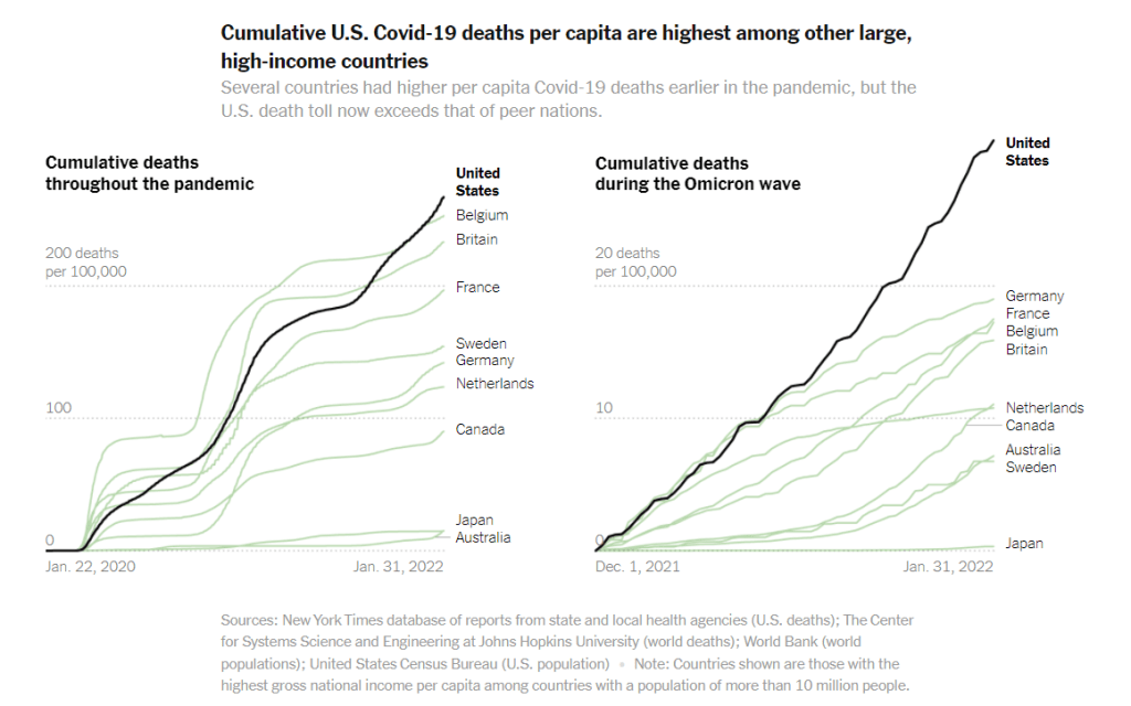 - The U.S.’s death toll during the Omicron surge has been far higher than in similarly wealthy nations. A new analysis from the New York Times compares the death toll in the U.S. from December 2021 through January 2022, adjusted for population, to death tolls in peer wealthy nations like Germany, Canada, Australia, and Japan. The comparison is striking: “the share of Americans who have been killed by the coronavirus is at least 63 percent higher than in any of these other large, wealthy nations,” the NYT reports. This difference is largely because the U.S. is less vaccinated than these other countries, particularly when it comes to booster shots and vaccinations among seniors.
